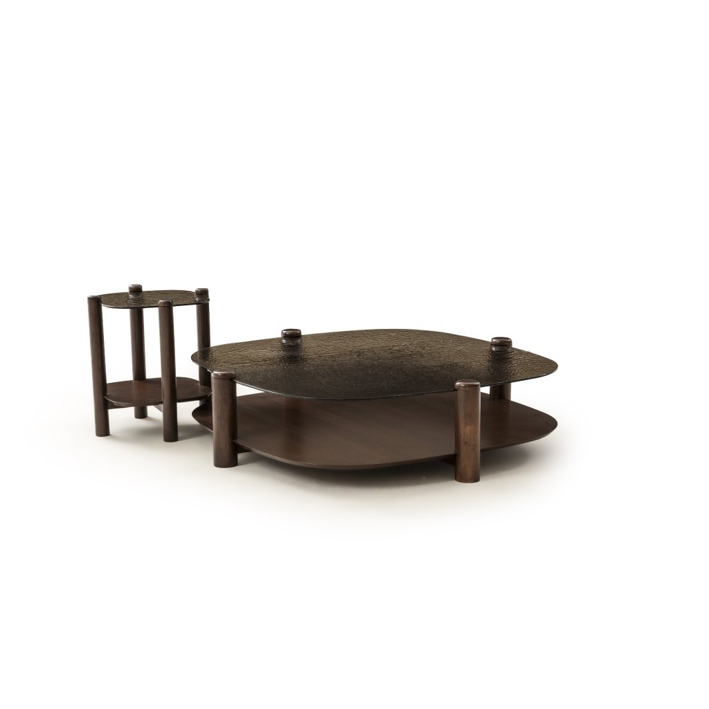 Menší odkládací stolek Brigada v přírodním jasanovém dřevě s kaleným bronzovým fusionovým sklem a praktickou spodní policí. je legantním a funkčním doplňkem do moderního interiéru.