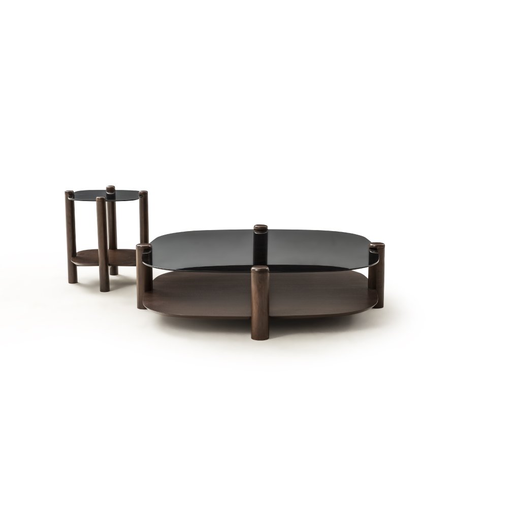 Konferenční stolek Brigada s deskou z kouřového skla a dýhovaným korpusem v tmavém dubu. Oblý tvar a dvouúrovňové řešení nabízí elegantní a funkční odkládací prostor. Nadčasový...