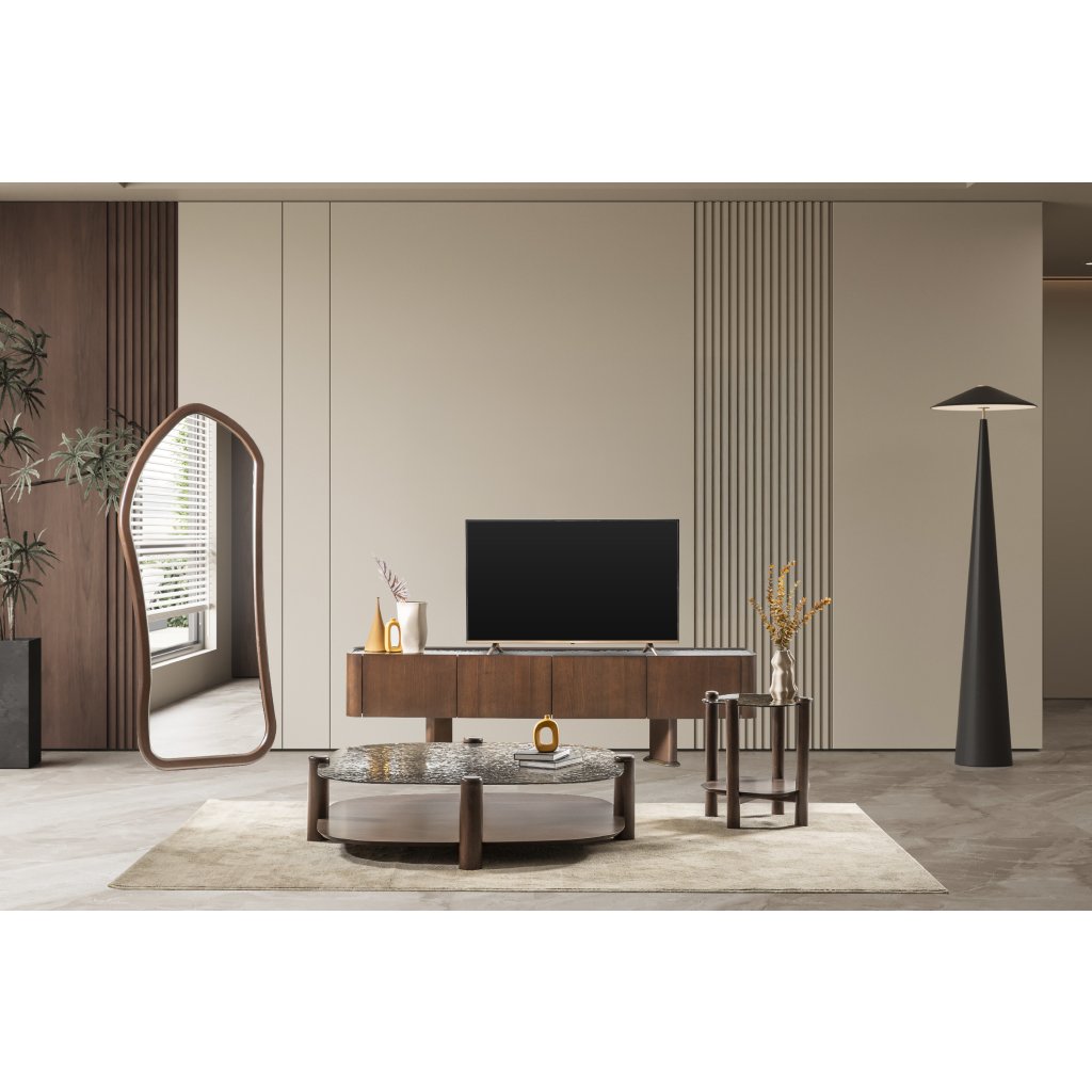 Luxusní sada konferenčních stolků Westham, která promění každý obývací prostor. Elegantní mramorová základna, zlatá kovová tyč a kulatá ořechová deska vytvářejí harmonický a...