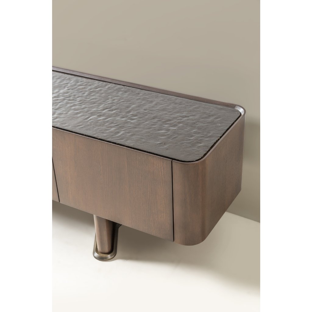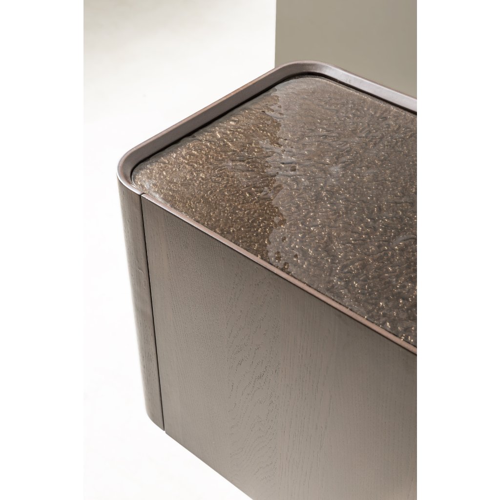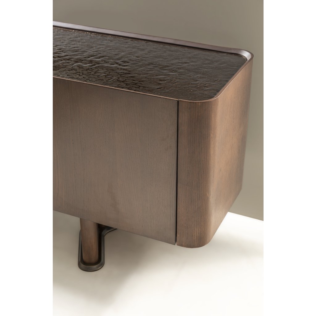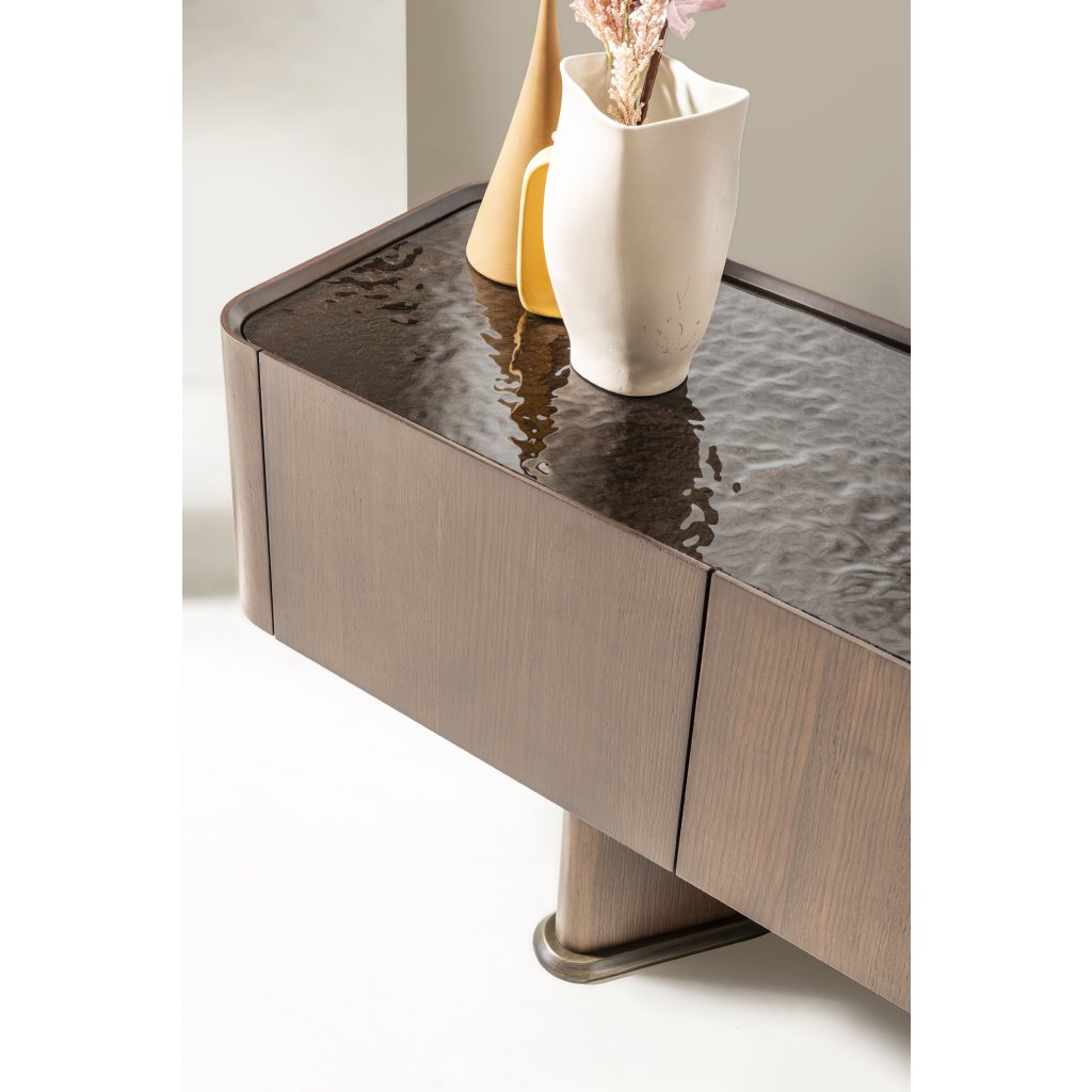 Designová komoda Brigada v délce 220 cm v sobě spojuje přírodní eleganci s moderním akcentem v podobě vložené skleněné desky Fusion. Tato deska z kaleného skla má jemný bronzový lesk, který působí luxusně a zároveň zůstává decentní. Sklo je zapuštěné do horní plochy a vytváří sofistikovaný kontrast k teplé kresbě dýhy v přírodním tmavém dubu.