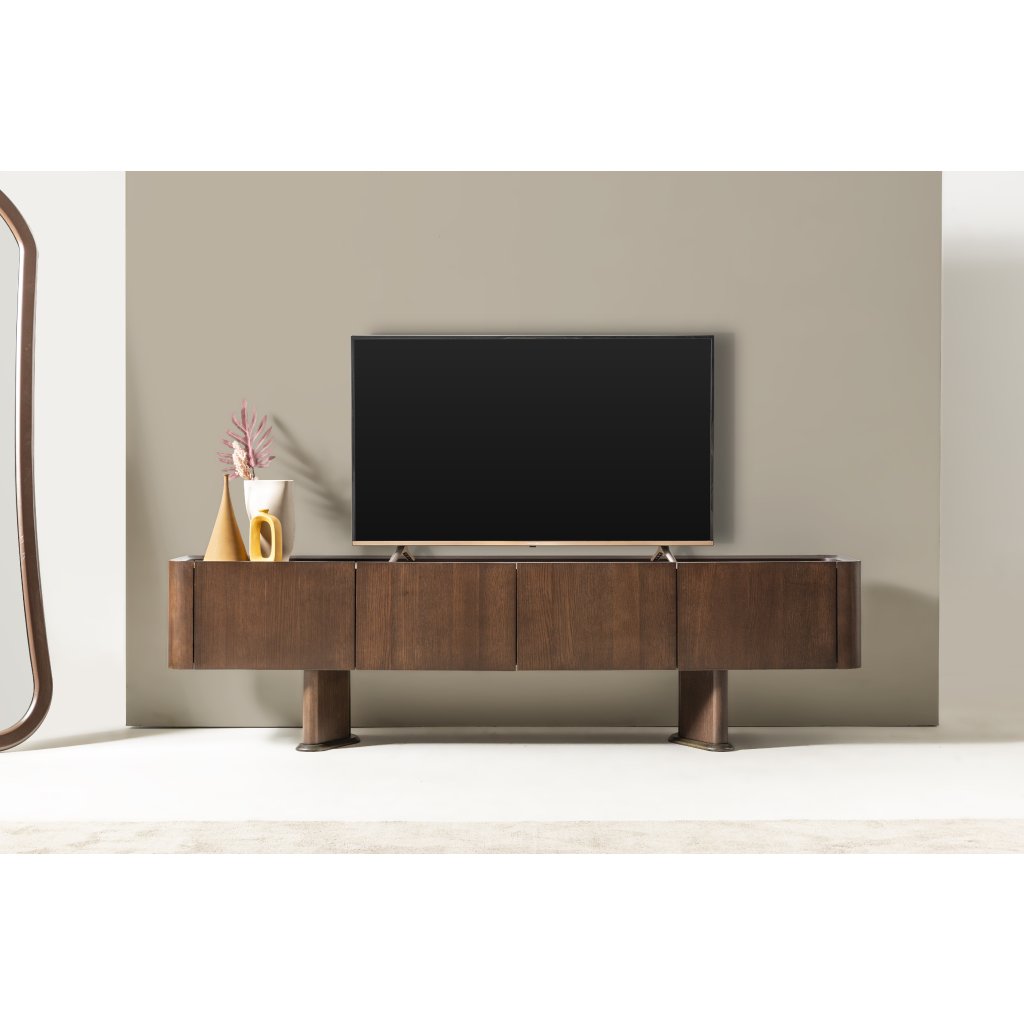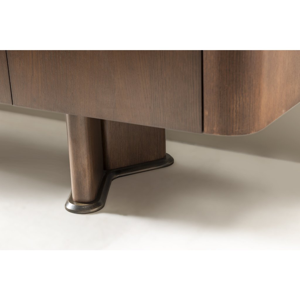 Minimalistická čelní plocha s čtyřmi dvířky bez viditelného kování zachovává čistý vzhled nábytku. Uvnitř se ukrývá praktické členění s policemi pro přehledné uložení. Stabilitu zajišťují dvě výrazné designové nohy, které směrem k podlaze doplňuje jemný zlatý lem – elegantní detail, který podtrhuje promyšlený design.