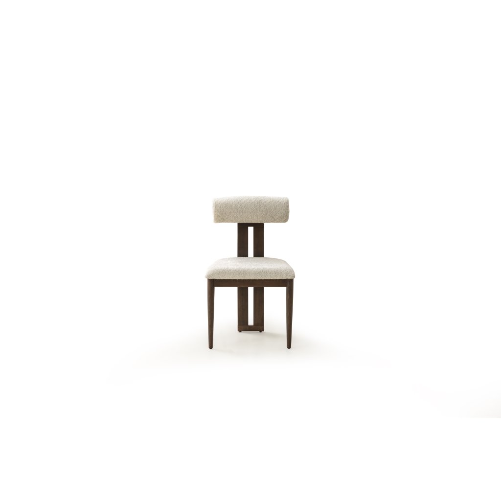 Zaujme na první pohled svým čistým a neotřelým tvarem, který vypadá, jako by spočívala na třech nohách – tato subtilní asymetrie dodává židli výraz i lehkost. Sedák a opěrka jsou čalouněny látkou typu bouclé, která se vyznačuje měkkou, smyčkovou strukturou. Bouclé je nejen vizuálně zajímavé a na dotek příjemné, ale zároveň praktické a odolné pro každodenní používání.