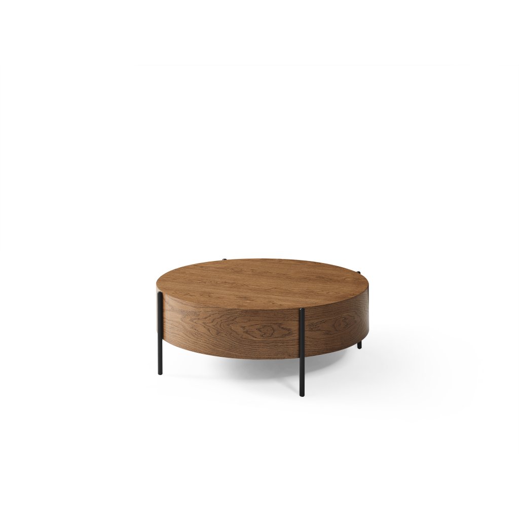 Designový dřevěný konferenční stůl ze série Wagon v ořechovém provedení se zaoblenou horní deskou a šuplíkem.