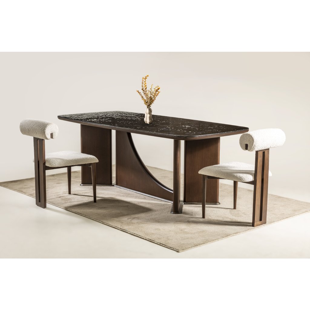 Židle Brigada z masivního habrového dřeva s čalouněním v měkké bouclé látce. Minimalistický tvar, jemná asymetrie a harmonické ladění k tmavému dubu.