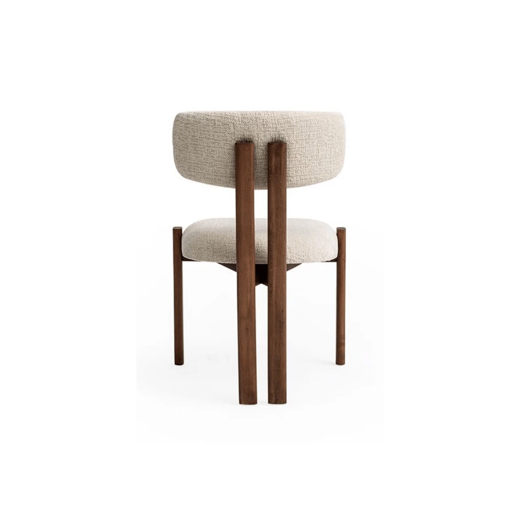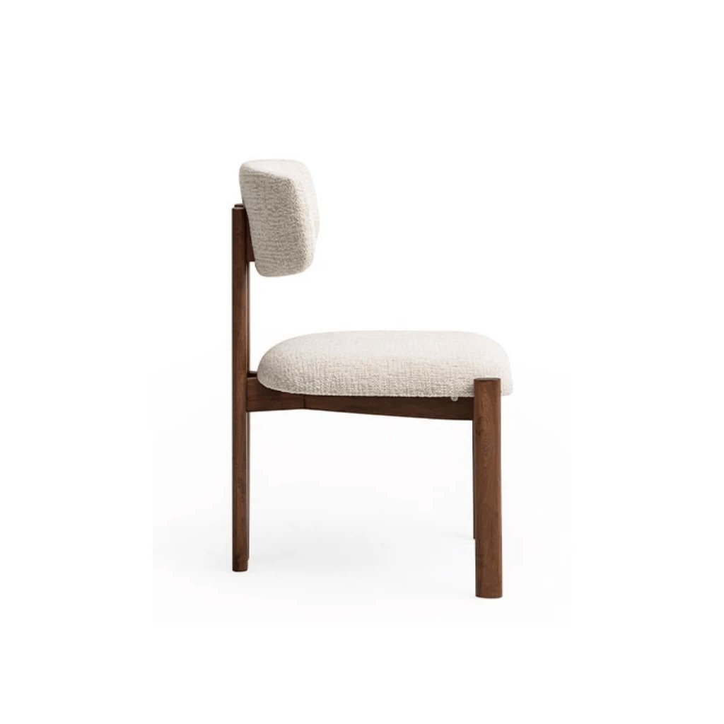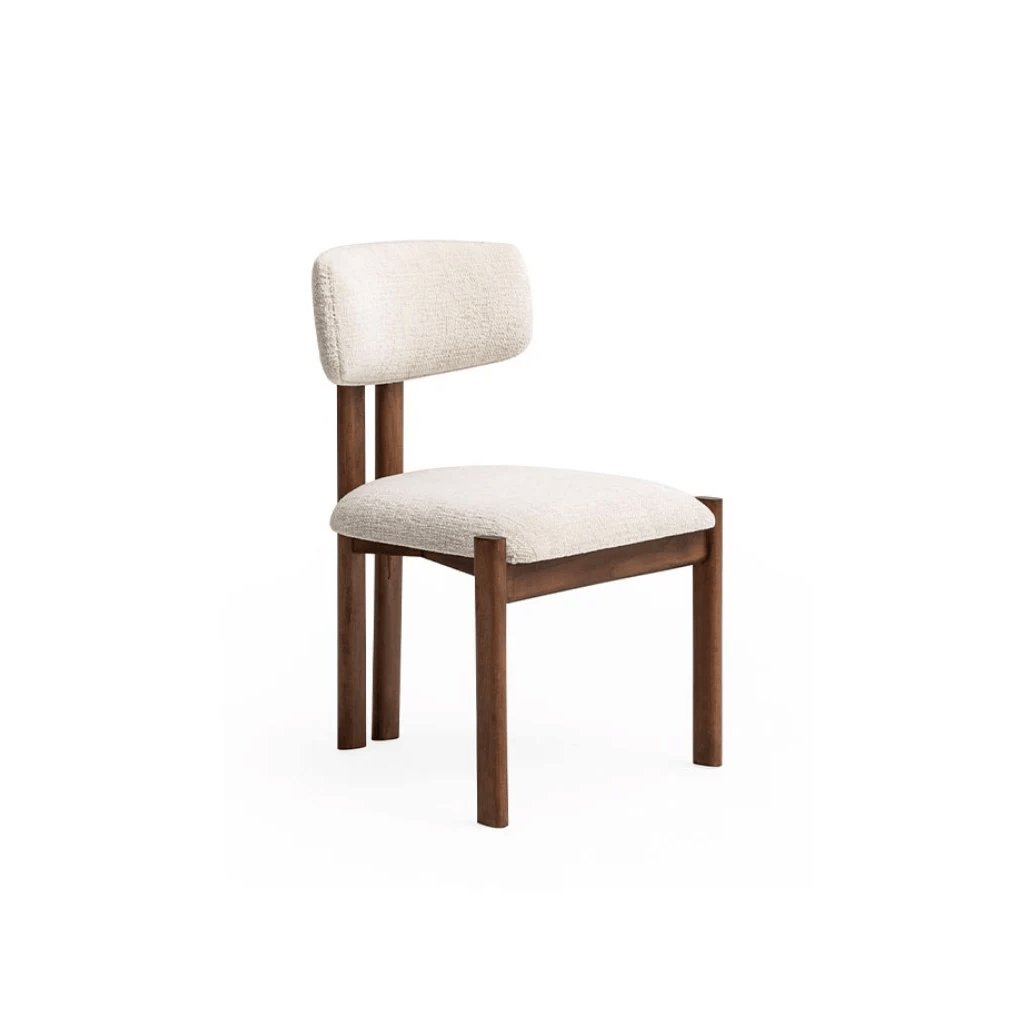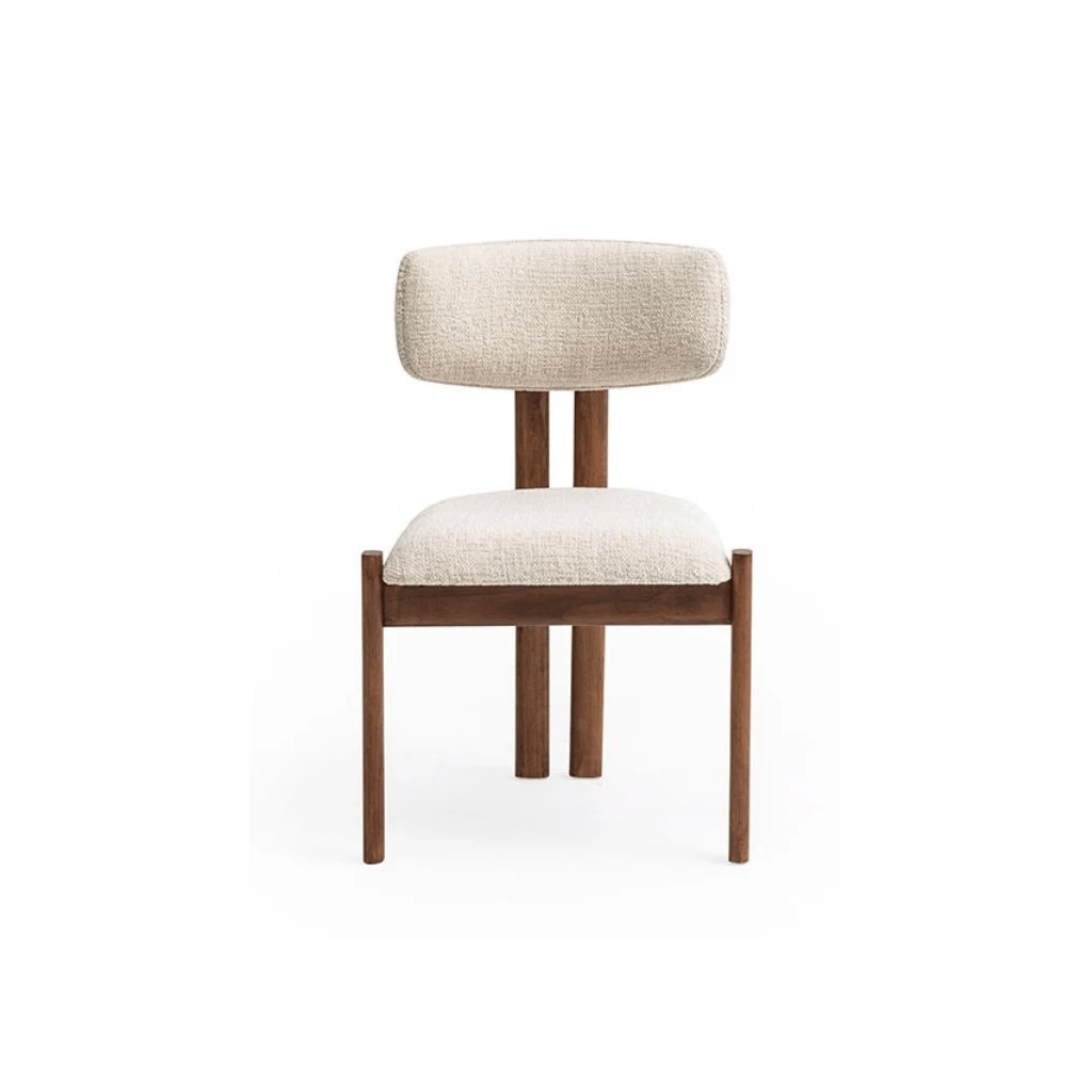 Židle Brigada z masivního habrového dřeva s čalouněním v měkké bouclé látce. Minimalistický tvar, jemná asymetrie a harmonické ladění k tmavému dubu.