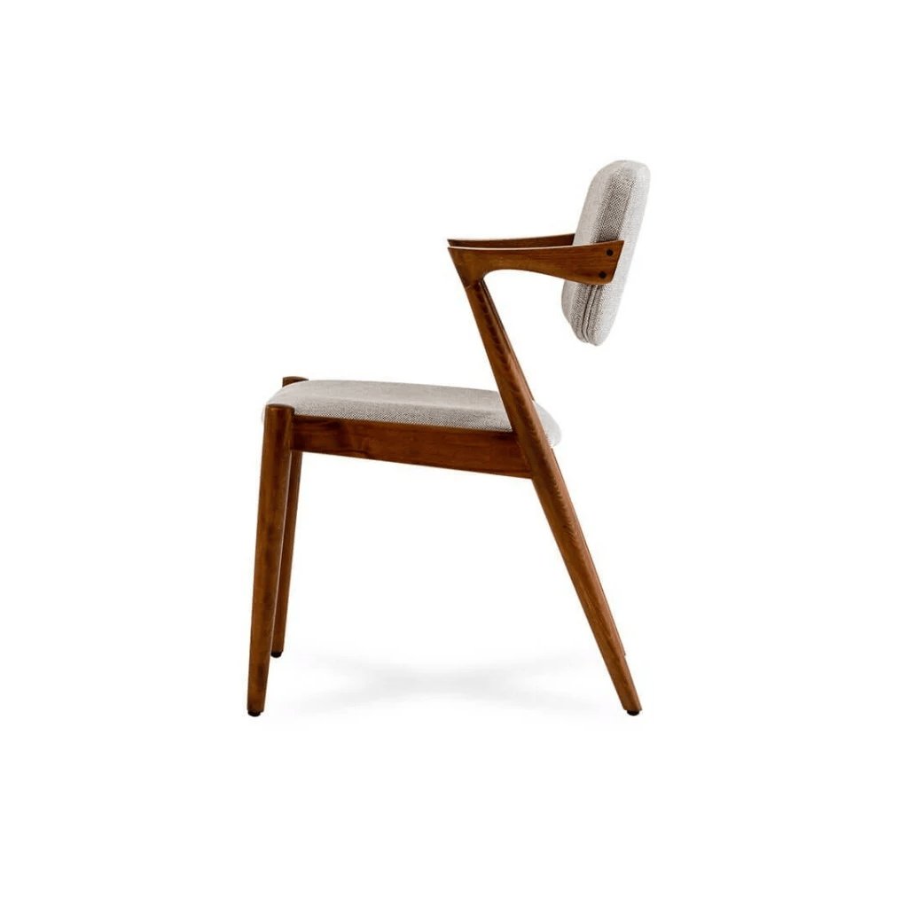 Židle Brigada z masivního habrového dřeva s čalouněním v měkké bouclé látce. Minimalistický tvar, jemná asymetrie a harmonické ladění k tmavému dubu.