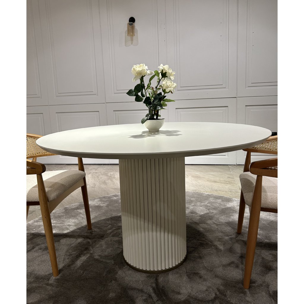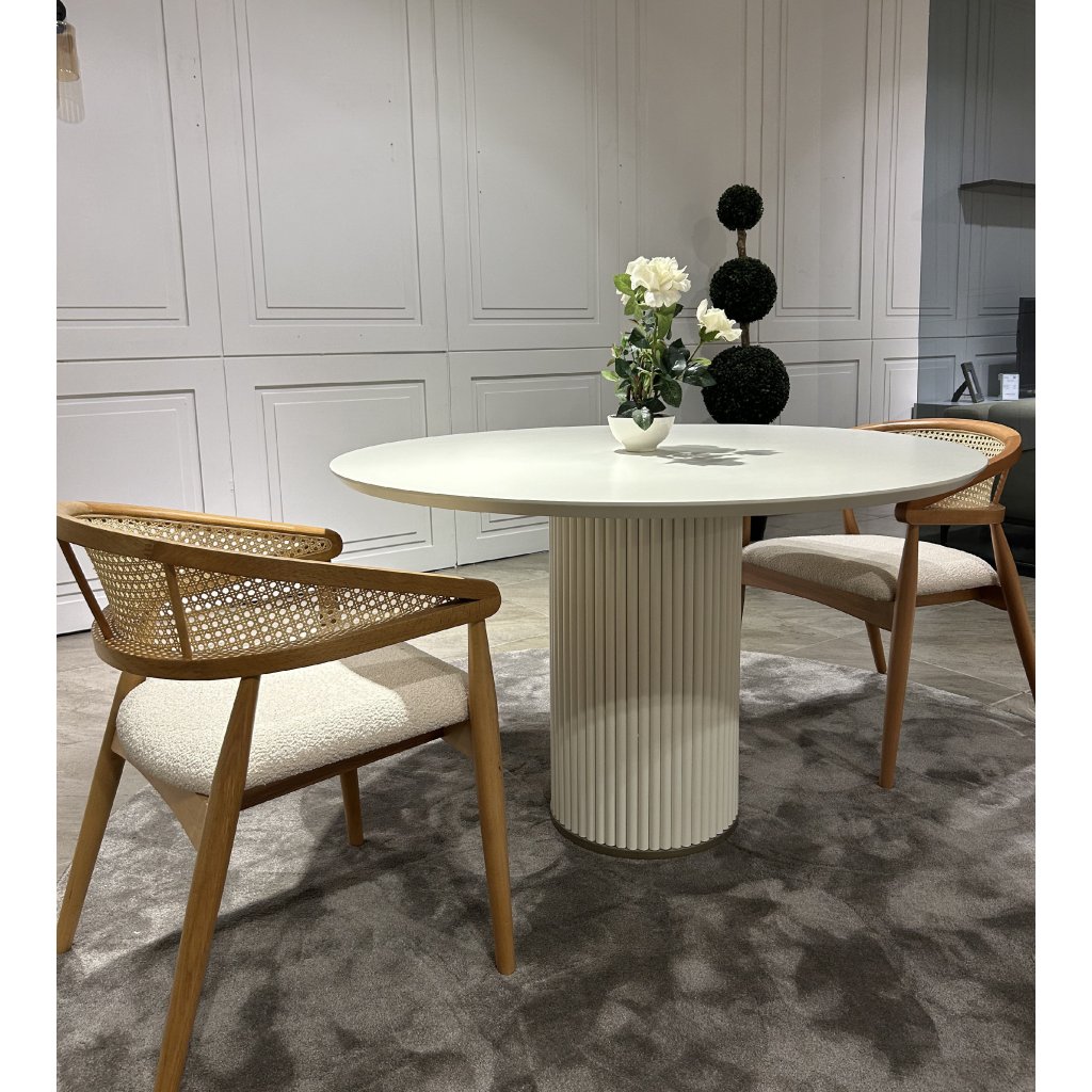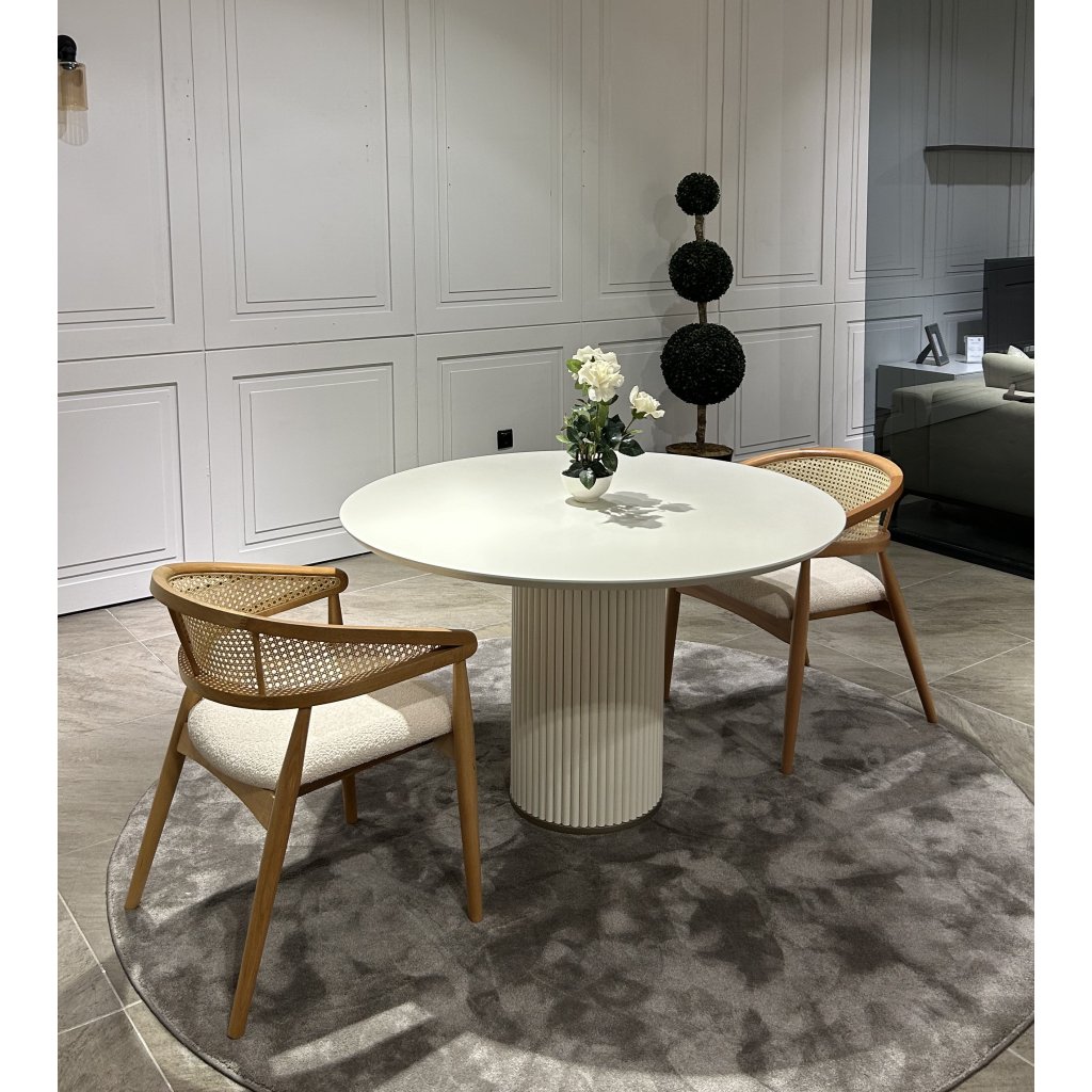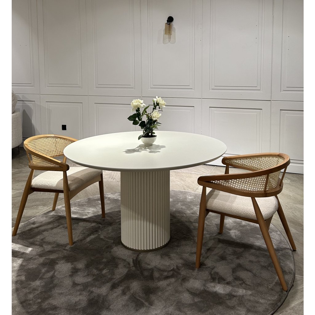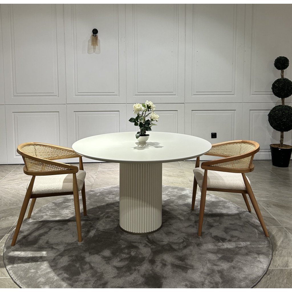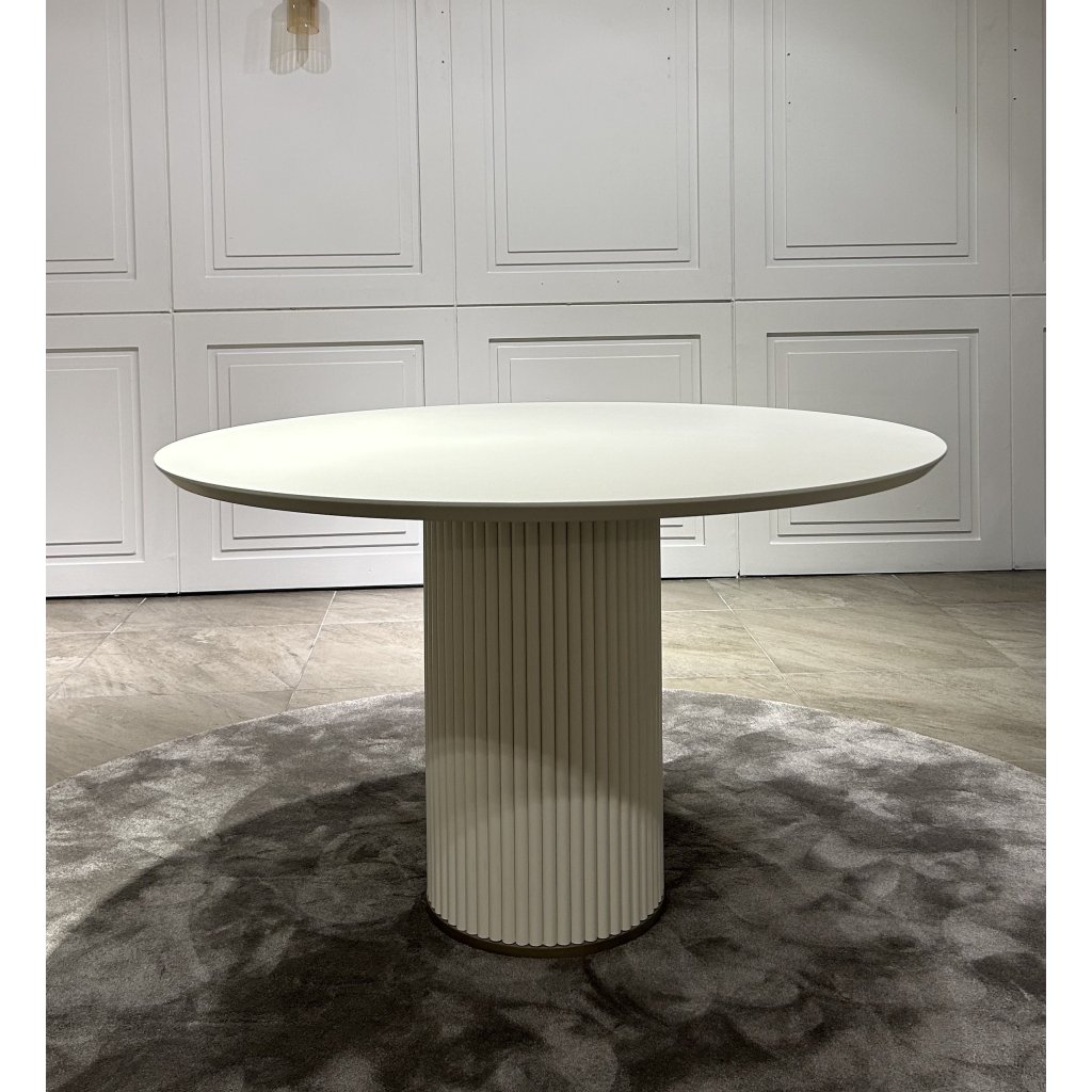 Jídelní stůl Luna je moderní a nadčasový kousek, který zaujme svou čistou formou a precizním zpracováním. Kulatá deska o průměru 100 cm poskytuje komfortní prostor pro 4 osoby, což jej činí ideálním pro menší rodinné či přátelské posezení. Centrální noha ve tvaru sloupu s jemným žebrováním přidává stolku výrazný, ale nenápadný designový prvek.