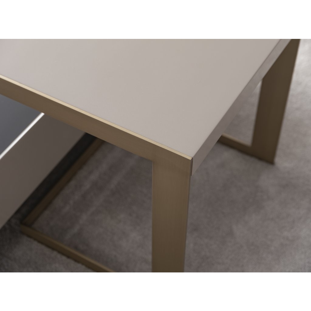 Tento stolek je praktický pomocník, který se vám může hodit leckde. Můžete ho použít jako odkládací stolek v obývacím pokoji, konferenční stolek, noční stolek, či stolek v předsíni. Je zajímavý matnou zlatou barvou a precizním provedením. Podnož je vyrobena je z kovu lakovaného elektrosatickou mosaznou barvou. Deska je vyrobena z MDF vysoké hustoty lakovaná elektrostatickou cappuccino barvou